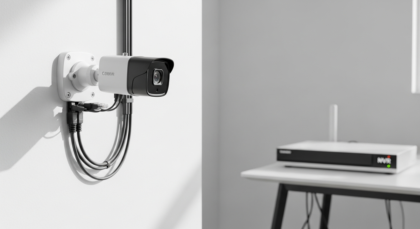 IP sistem za video nadzor koristi standardne mrežne kablove (UTP Cat5e/Cat6). Svaka kamera se jednim kablom povezuje direktno na NVR ili PoE svič.